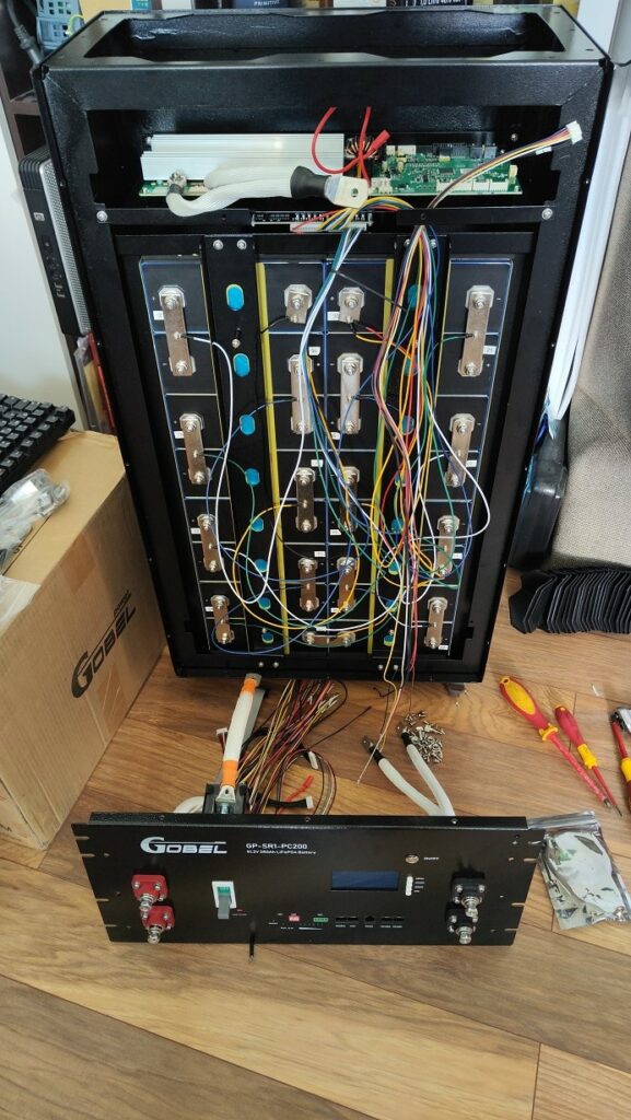Druga kwestia to wybór obudowy, na rynku AliExpress dostępnych jest wiele case’ów na ogniwa LFP4, jednakże wszystkie, które udało mi się znaleźć dostarczane są z BMS Seplos w wersji 2.0 lub 3.0, niestety żaden dostawca nie posiada JK-BMS, a tym bardziej Pace BMS, którego posiadam już w baterii OrientPower 5.12kW, dlatego też wybór padł na GobelPower DIY-Kit, który niedawno dopiero pojawił się w ofercie. Minus tego wyboru to dostawa z Chin na którą czekałem prawie 2 miesiące, z plusów to przesyłka jest w całości DDP czyli nic nie dopłacasz przy odbiorze. Link do obudowy: https://www.gobelpower.com/gobel-power-diy-kit-512v-280ah-battery-case-kit-with-bms-circuit-breaker_p124.html