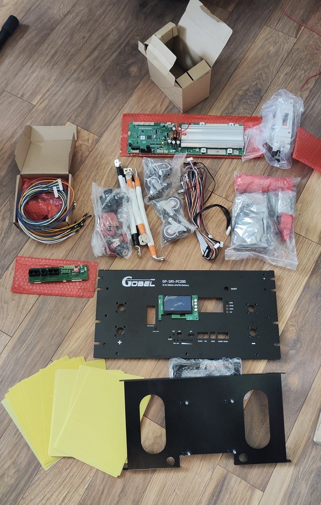 Cena łączna zestawu który zamówiłem to kwota 3349 zł, a przypada na nią obudowa, BMS Pace, wyłącznik DC 250A oraz aktywny balancer NEEY 4A. Zestaw po rozpakowaniu prezentuje się następująco.